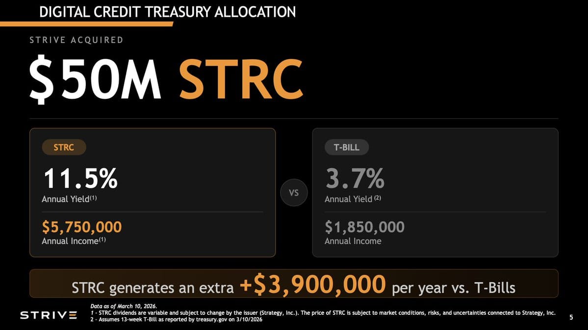 Strive has bought $50m of Strategy’s STRC preferred shares, alongside adding 179 BTC to its balance sheet and increasing the yield on its own preferred stock to 12.75%.