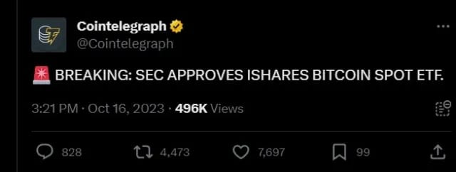 Bitcoin spiked 10% on CoinTelegraph’s tweet that Blackrock’s Spot Bitcoin ETF had been approved by the SEC. The news spread like wildfire and caused Bitcoin to rocket but it turned out to be false news.